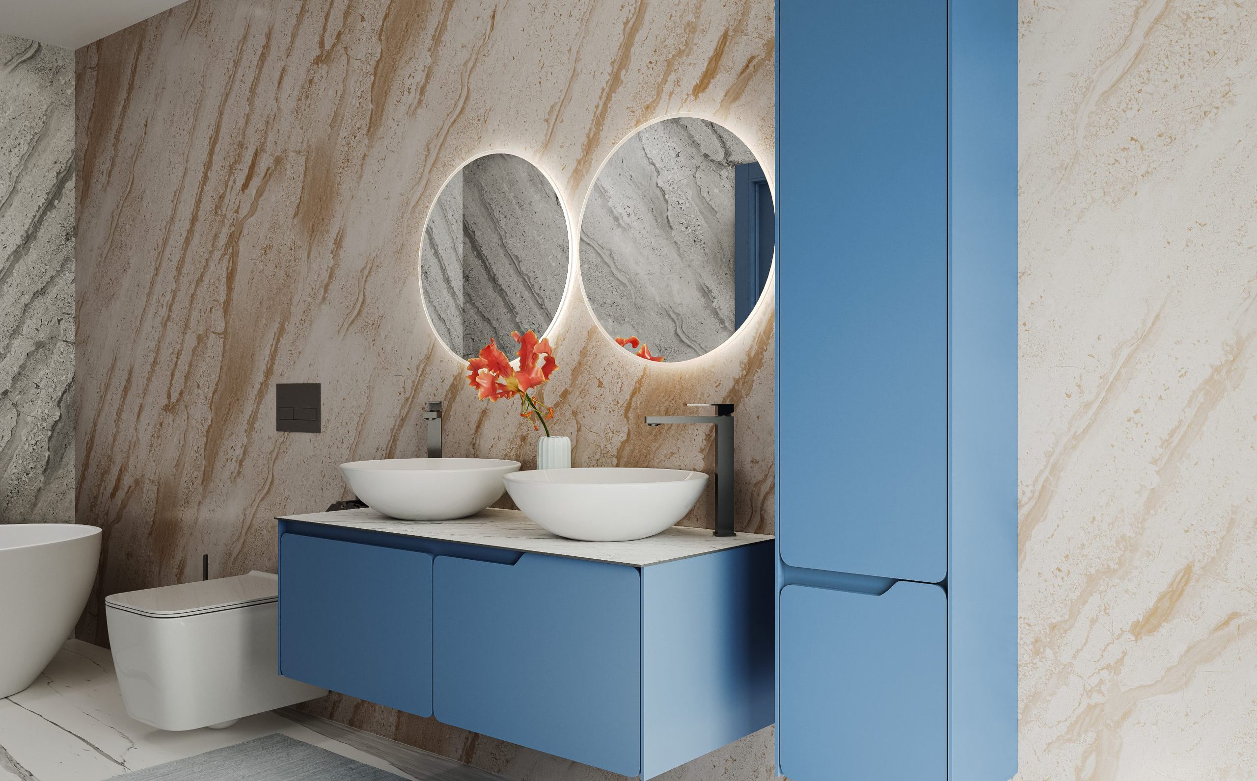 Die Spiegel bestehen aus feuchtigkeitsbeständigem AGC MIROX 3G-Glas und sind mit einer hochwertigen LED-Beleuchtung ausgestattet. Türen und Schubladen sind mit hochwertigen Beschlägen von Blum und Hettich versehen, während Waschbecken von CeraStyle (Türkei), Kolo (Polen) und Aqua Rodos (Ukraine) das Möbeldesign perfekt ergänzen.